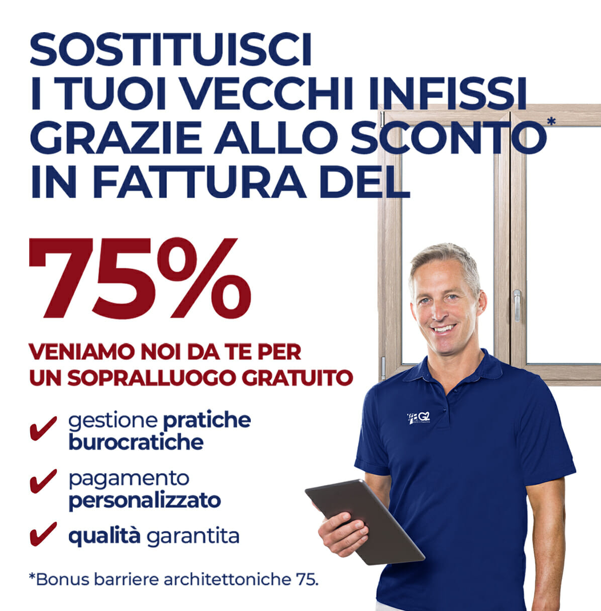 Pensiamo a tutto noi! Se acquisti infissi che ti consentono di accedere a bonus particolari, come il bonus Barriere Architettoniche, i nostri esperti si occuperanno direttamente della compilazione dei documenti e della presentazione delle pratiche per accedere al bonus e usufruire dello sconto in fattura del 75% grazie alla cessione del credito. Nello svolgimento delle pratiche avrai sempre la nostra assistenza.